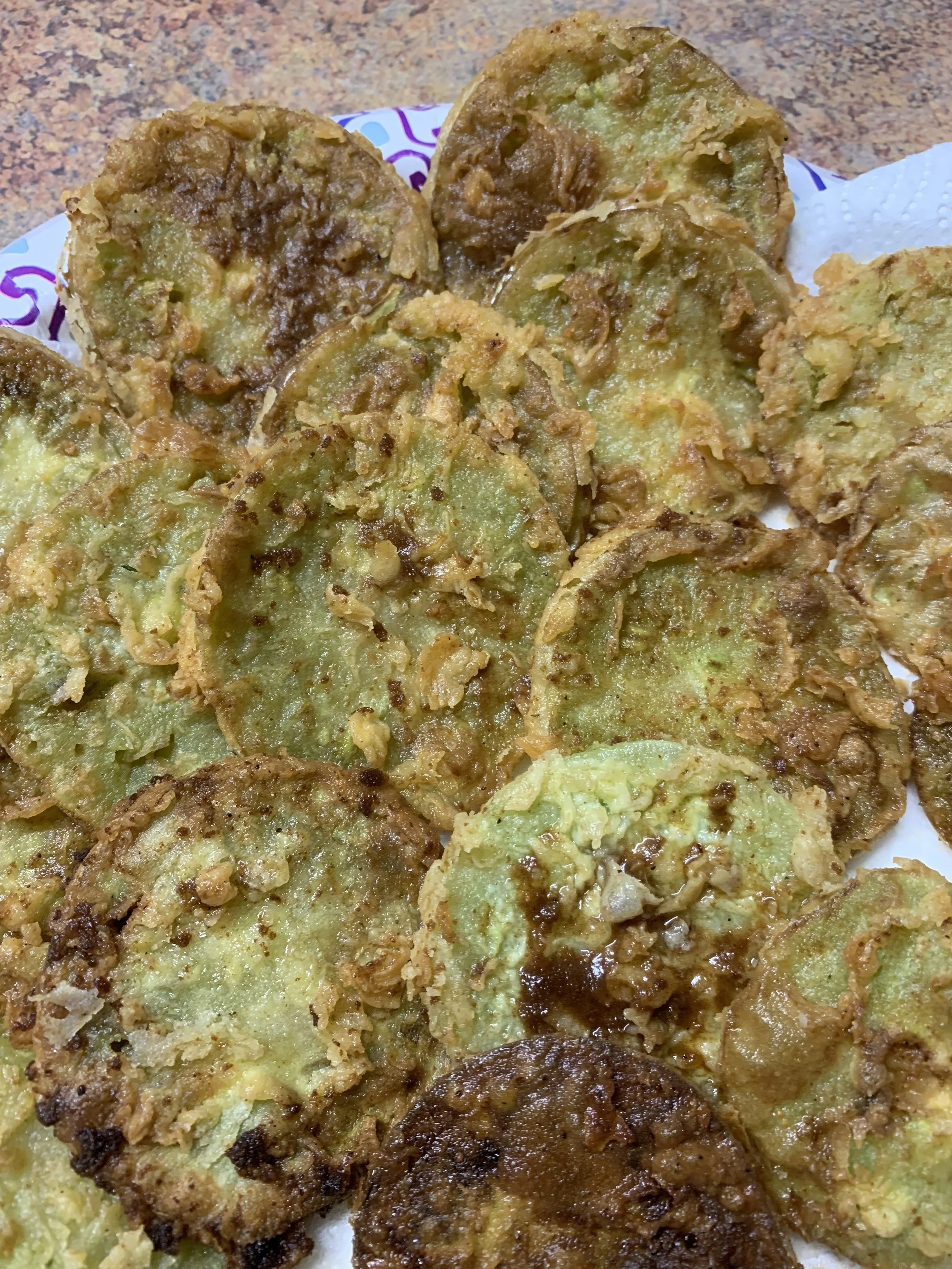 Now go back to your tomatoes and pat them down with paper towels. The salt will have drawn out the moisture, which will make them even better once they’re fried.