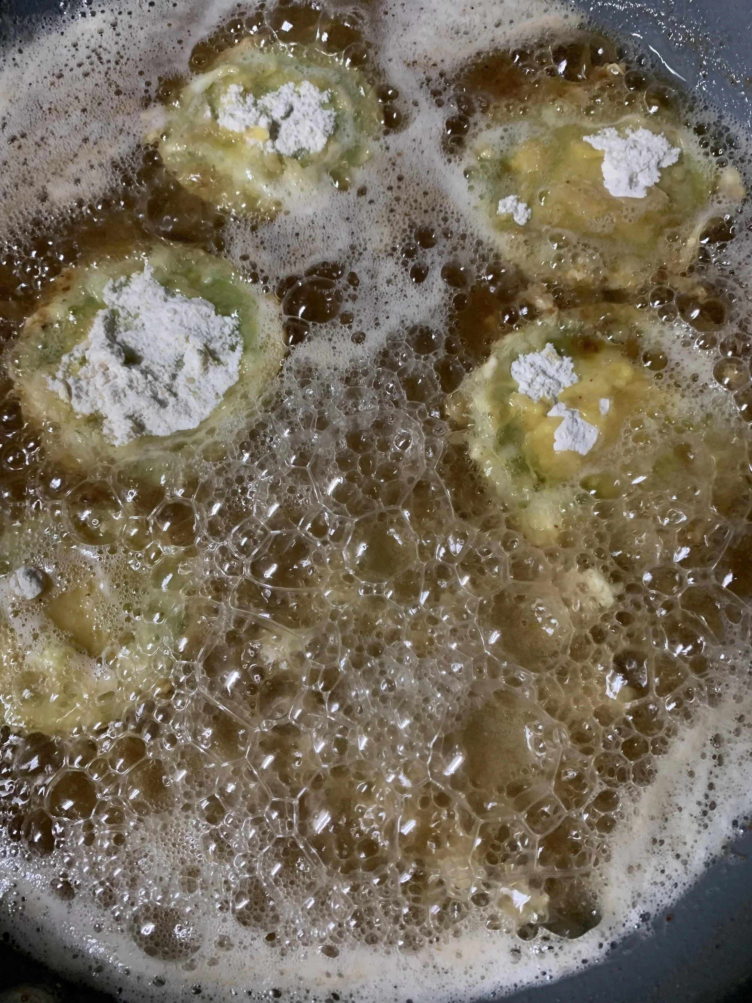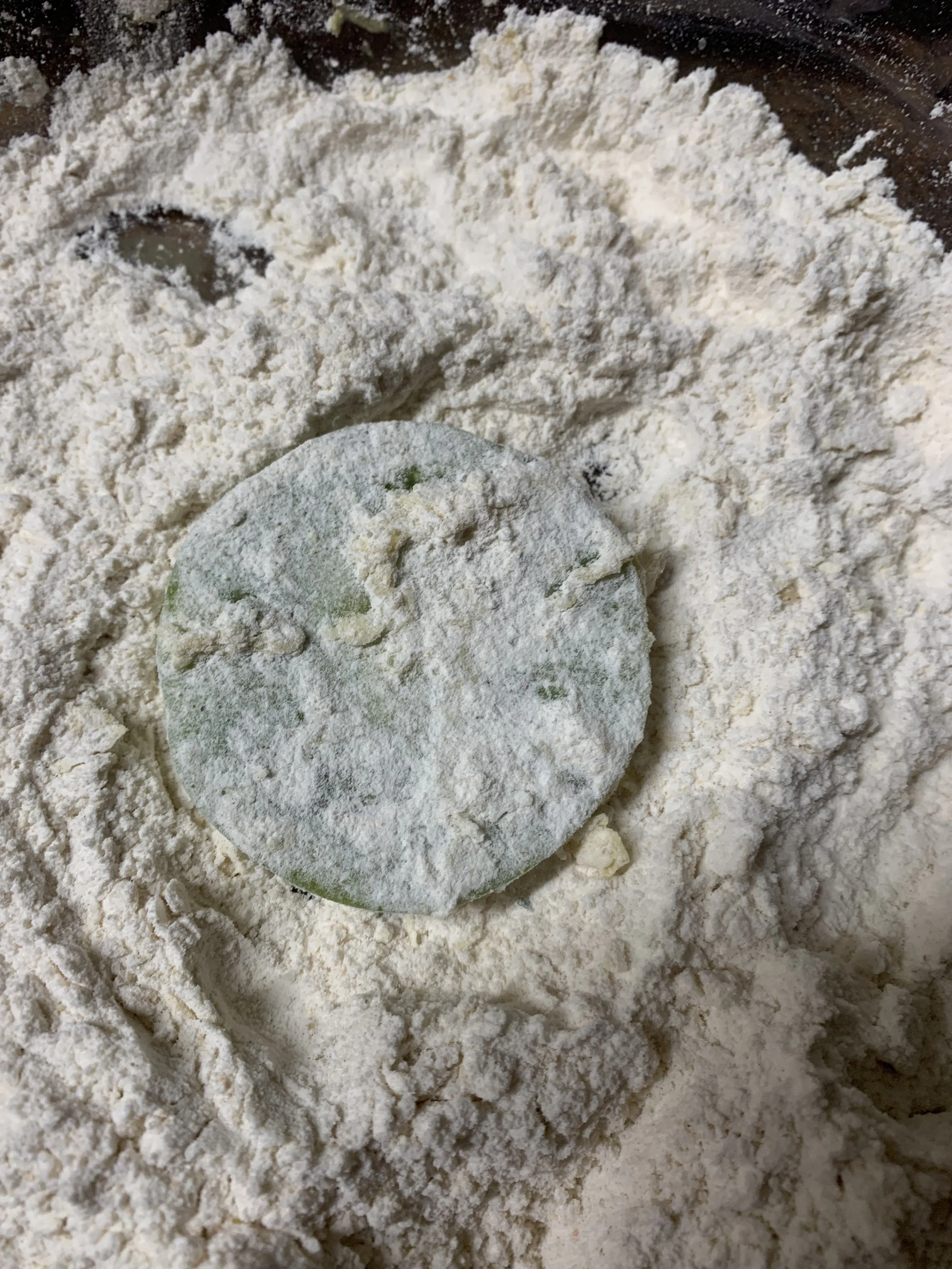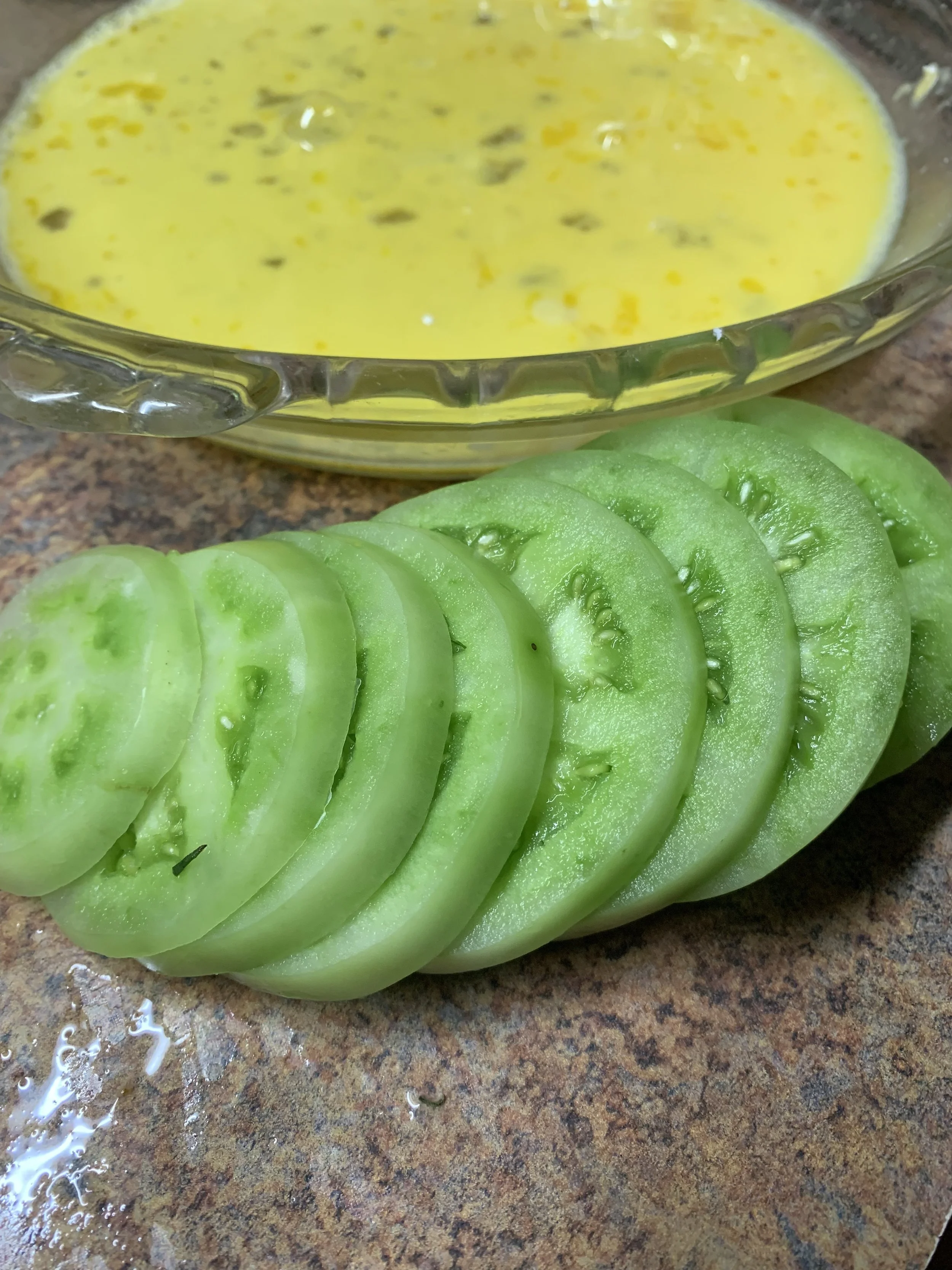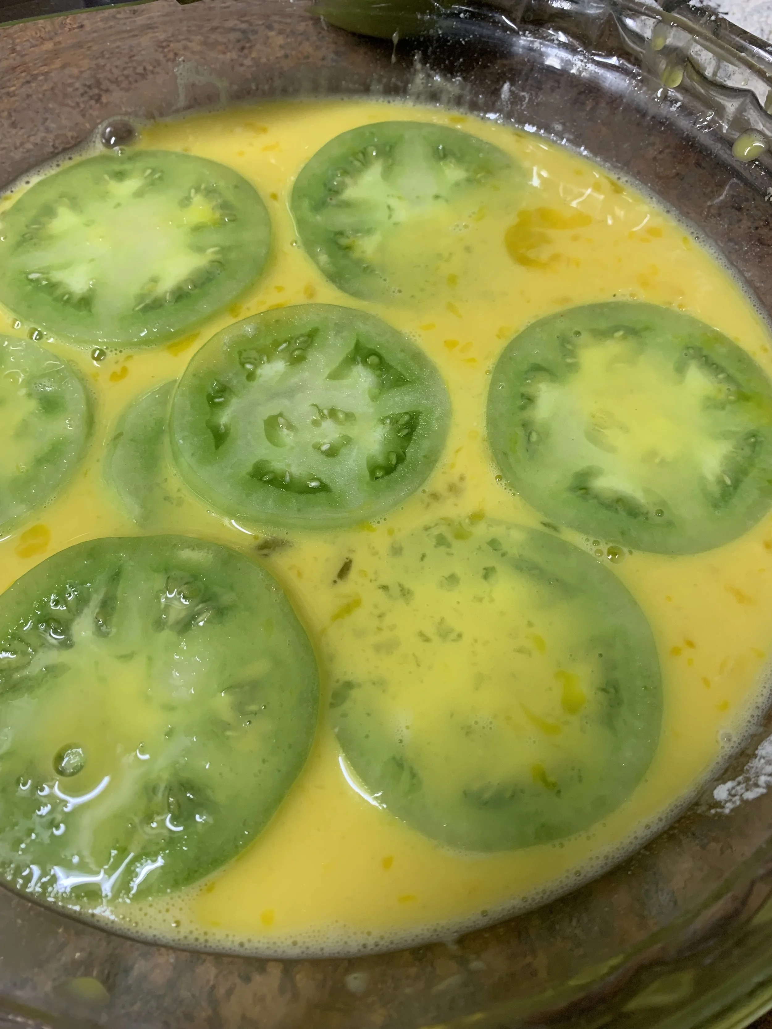 Dip a tomato slice into your egg mixture before putting it into the flour and seasoning mix. Thoroughly coat the slice in flour before carefully putting it into the oil. The oil should immediately begin sizzling. Repeat this process with more slices. I usually fry five or six tomatoes at a time.